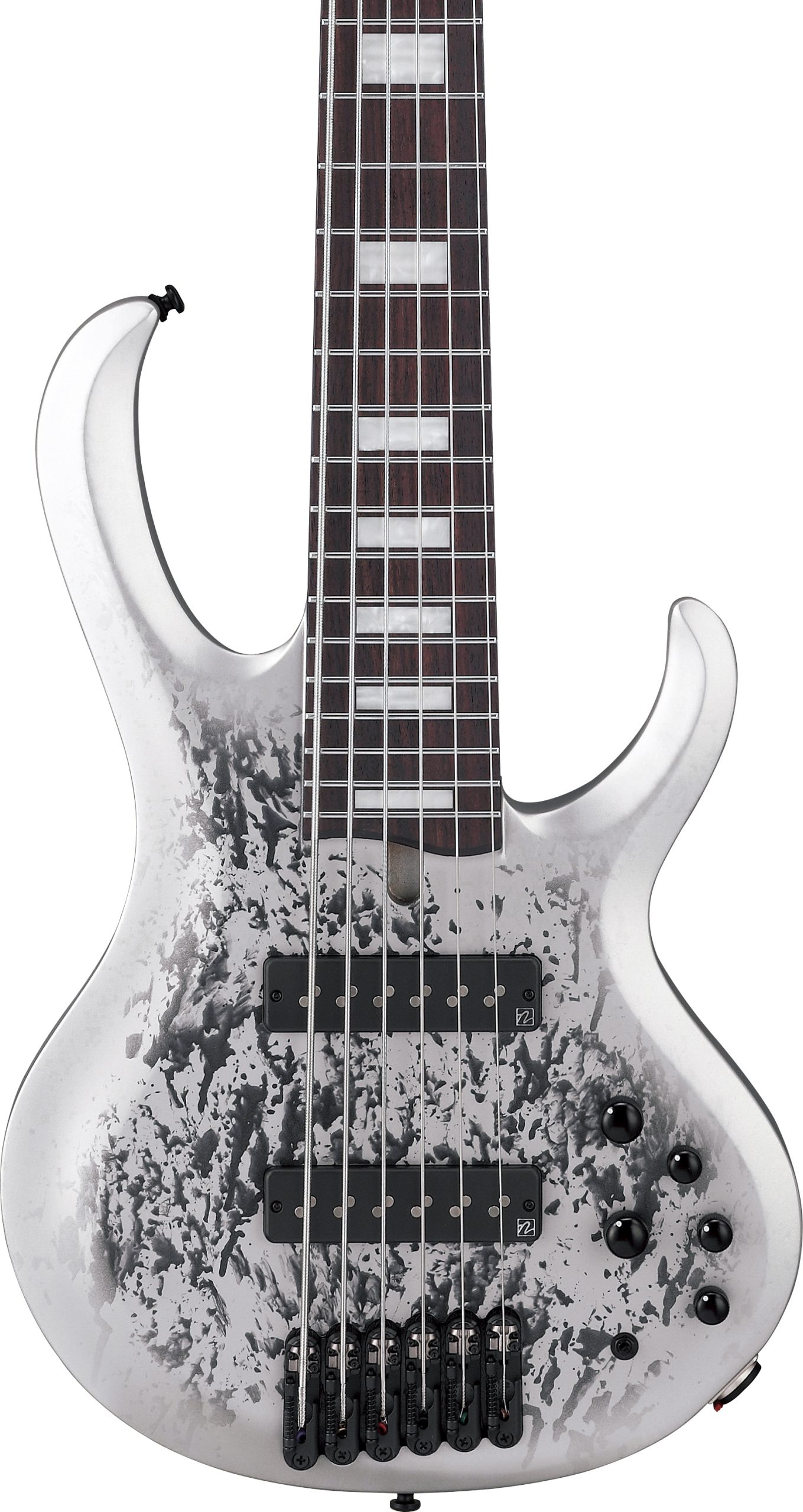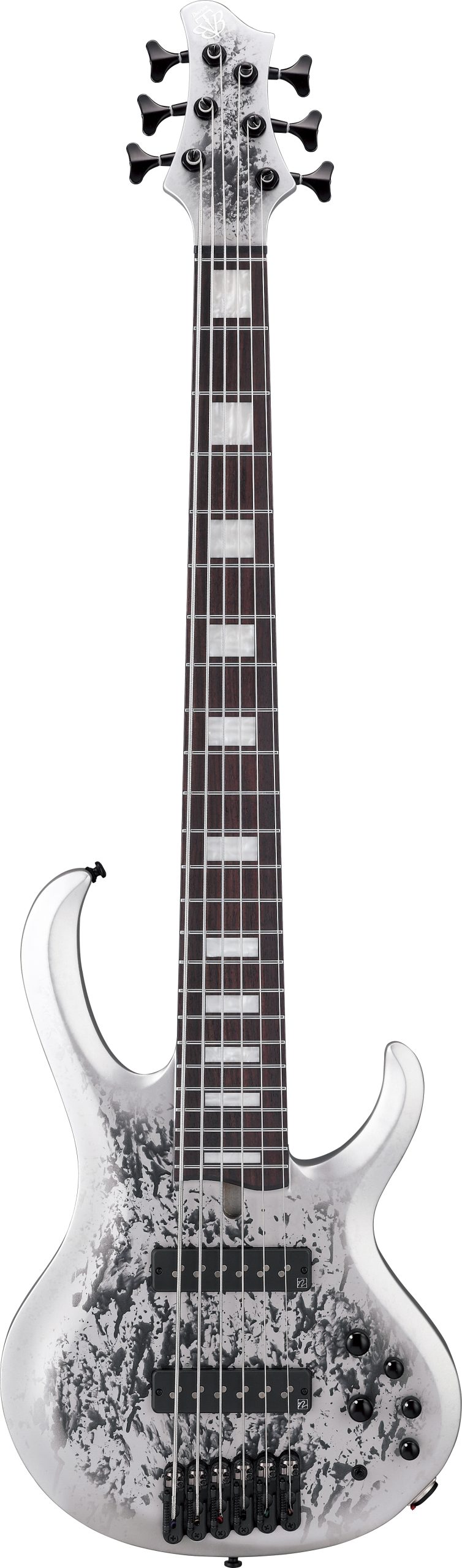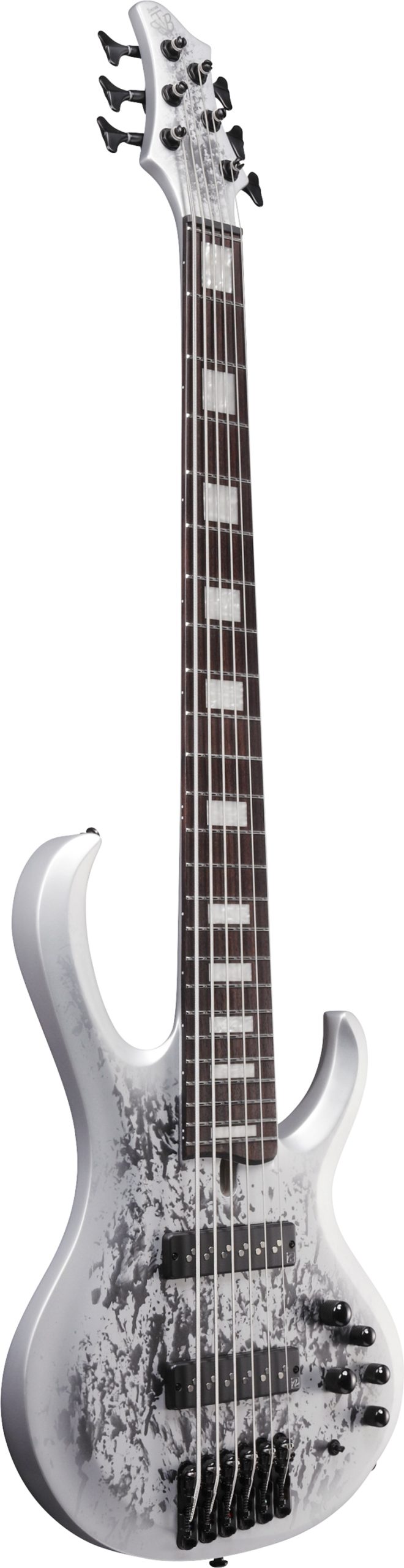 The Ibanez BTB25TH6-SLM is a six-string bass guitar featuring a neck-through construction with a 5-piece Maple/Walnut neck, Okoume/Ash wing body, and a Panga Panga fretboard. It includes Ibanez Custom Electronics 3-band EQ with a 3-way Mid frequency switch and MR5S bridge.