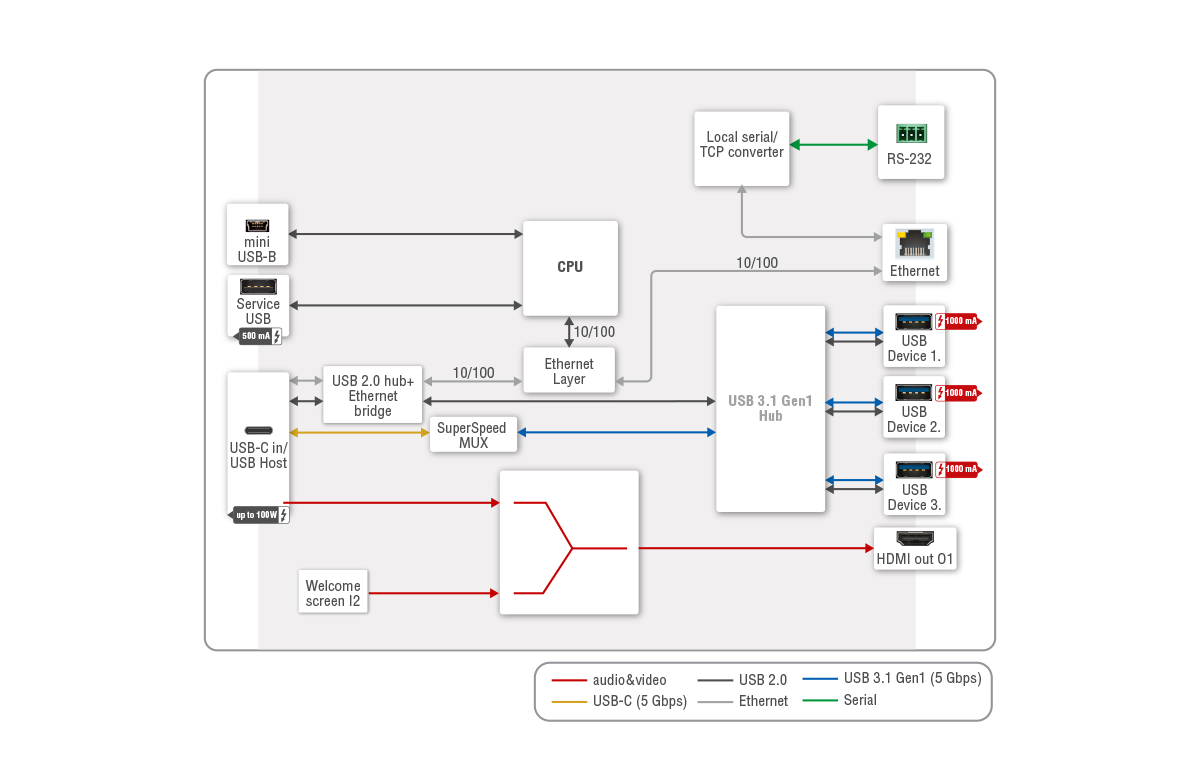 The device utilizes USB-C connectivity for simplified transmission of video, audio, control signals, and power, supporting data speeds of up to 5 Gbps under USB 3.1 Gen1. It enables video resolutions up to 5K (5120×2160) via HDMI 2.0 at 30Hz 4:4:4 or 60Hz 4:2:0, as well as 4K@60Hz at 4:4:4. Users who connect their laptop or other mobile device via USB-C can also enjoy charging up to 100W, thus eliminating the need to look for a wall plug and to avoid sudden interruption of meetings.