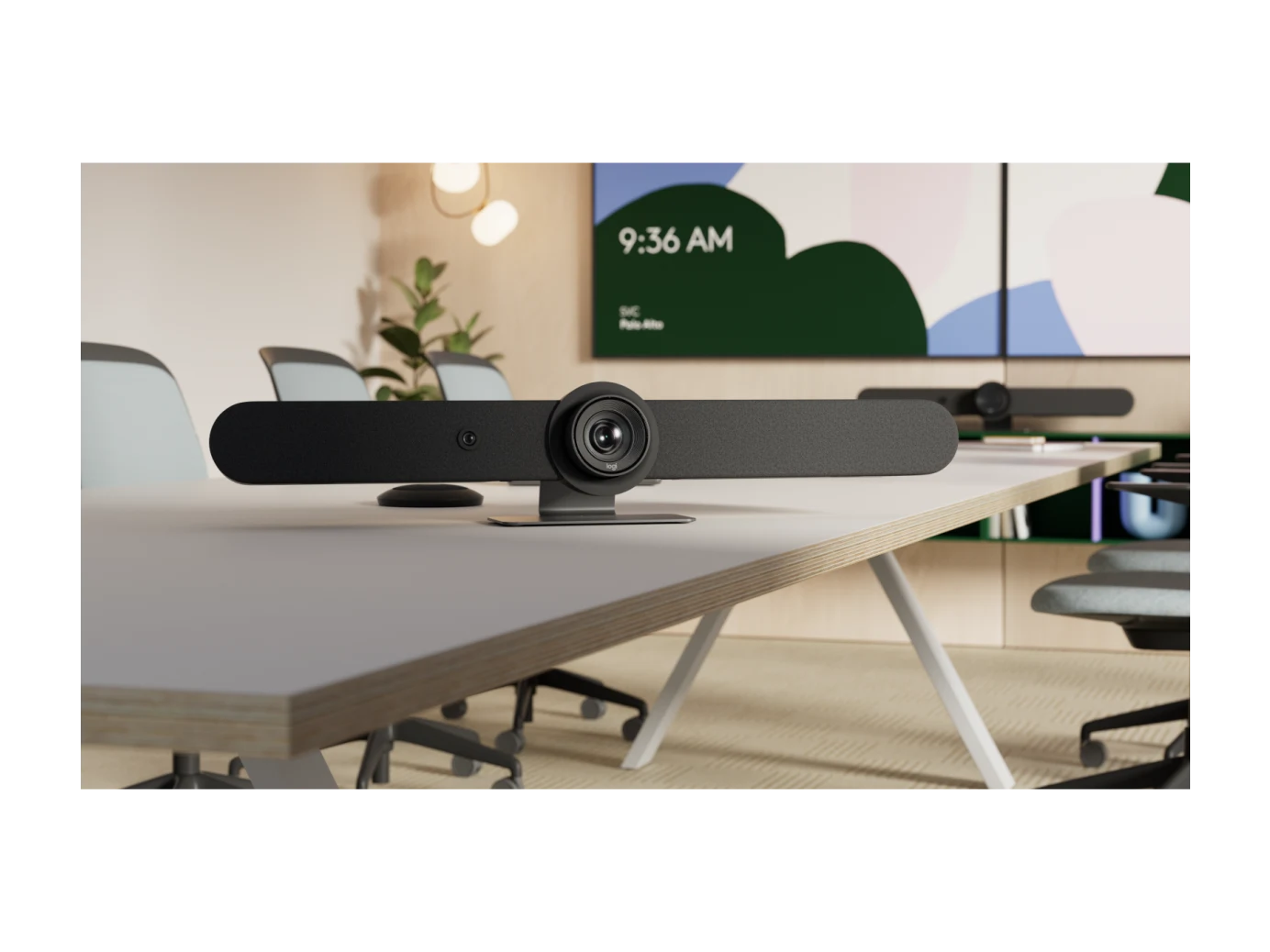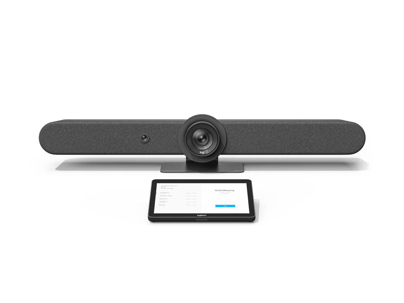 • Built-in components: 6 beamforming microphones, PTZ camera, 2 speakers, AI Viewfinder, cable management & retention system, table stand, Logitech CollabOS platform