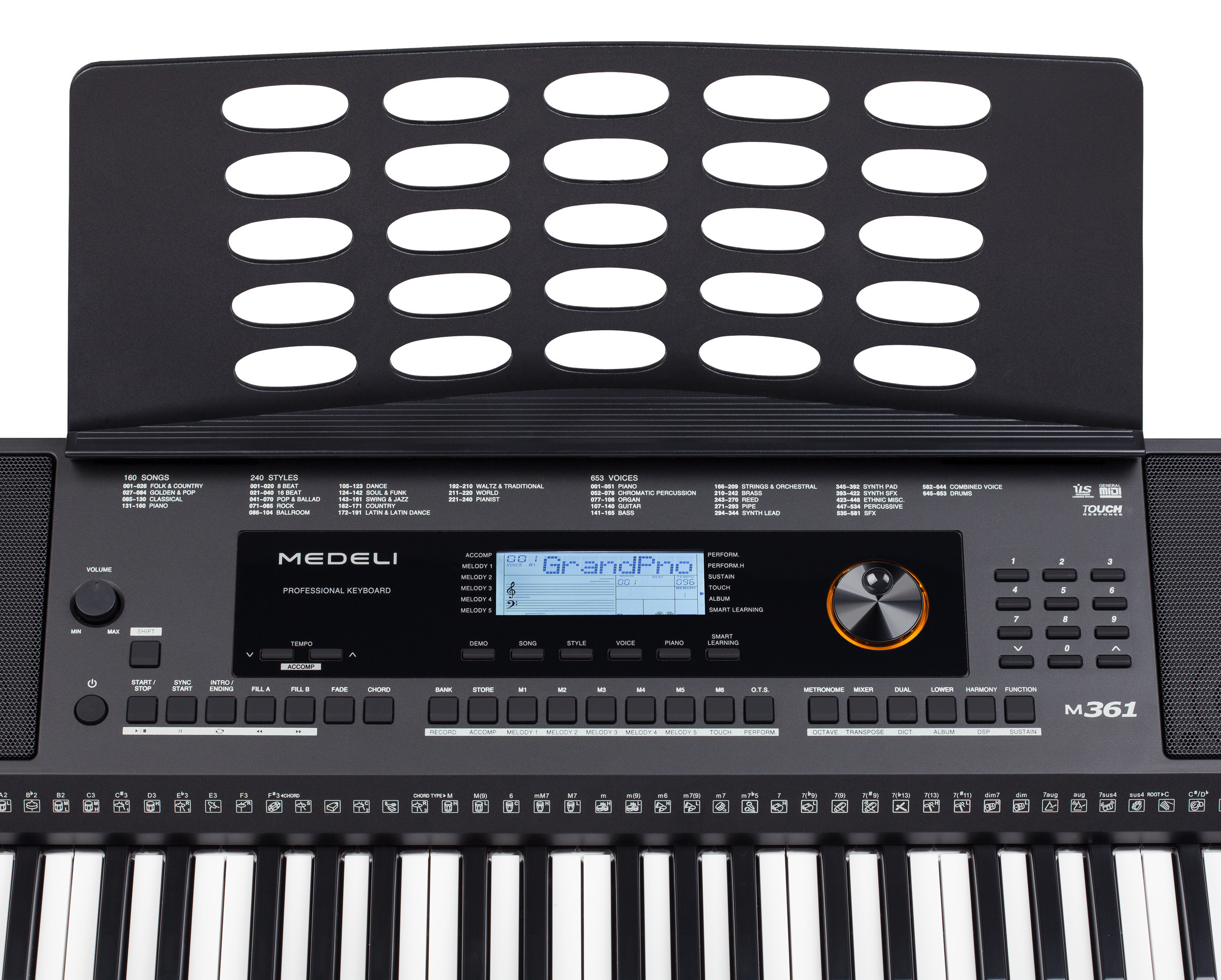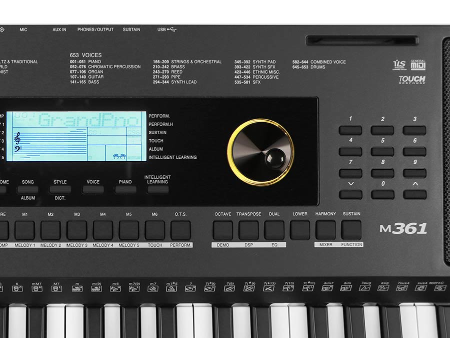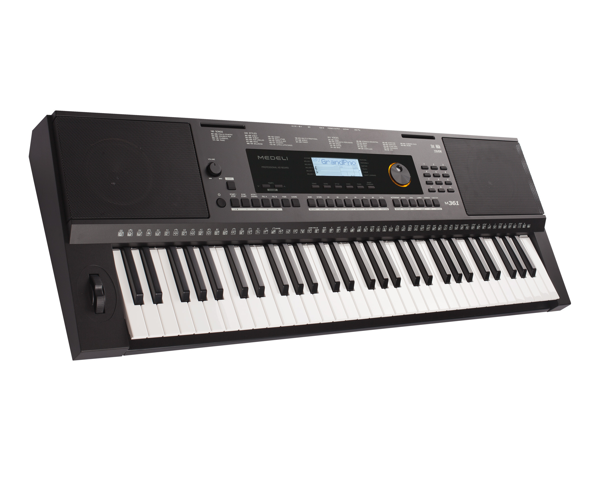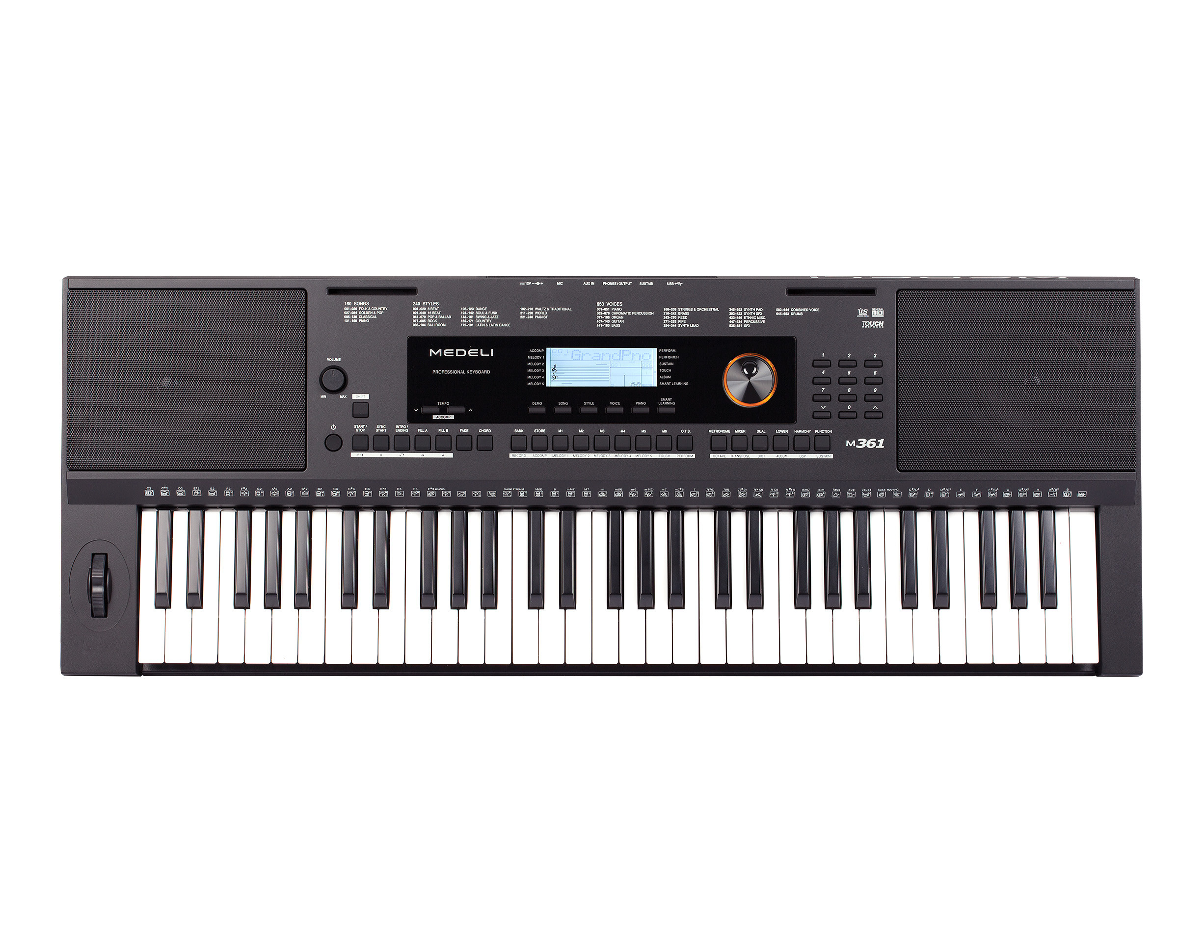 The Medeli M361 is a 61-key digital keyboard featuring 100 voices, 100 rhythms, and 50 demo songs. It includes a built-in metronome, recording function, and a 2-track sequencer. Connectivity options comprise USB MIDI, sustain pedal input, and headphone output. Ideal for beginners and practice sessions.