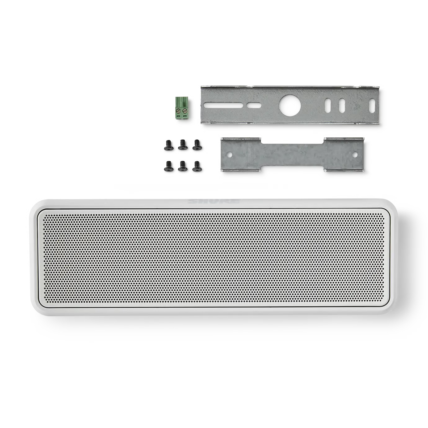 • Compact design with only 2.5-inch depth can be wall mounted horizontally or vertically, or on-ceiling with included mounting hardware  (Note:  Shure recommends the use of an additional safety tether for overhead components.)